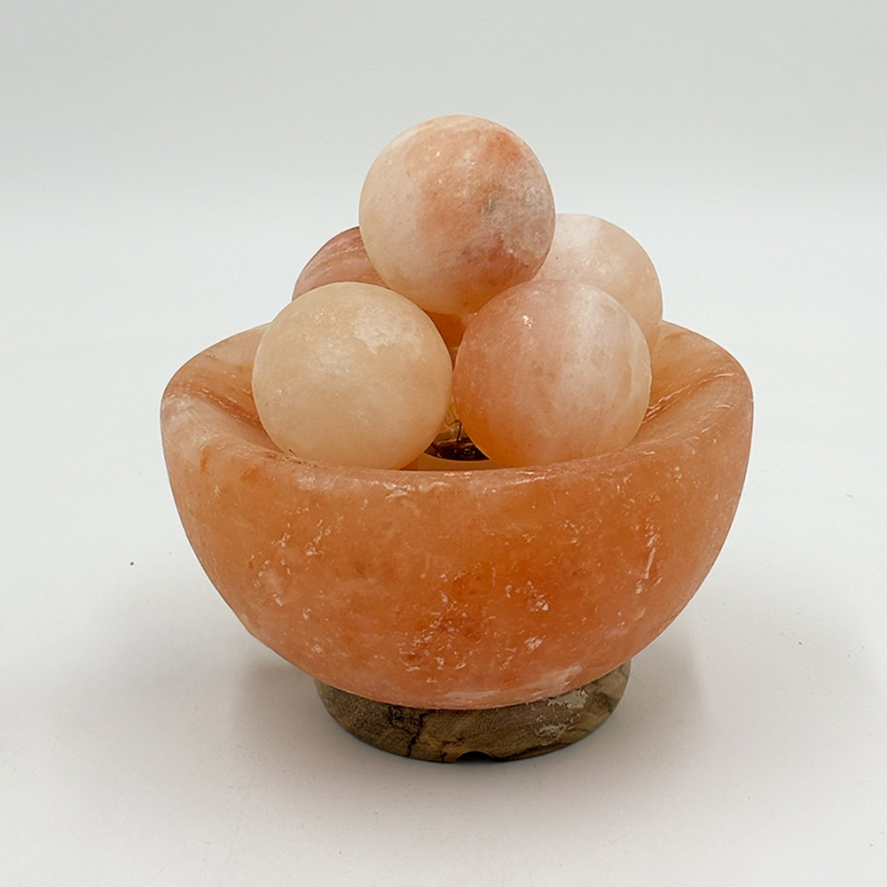Montata su base in legno stabile, ogni pezzo è unico grazie alle variazioni naturali delle sfere e delle venature del sale rosa. Perfetta per uso domestico in ambienti come salotti, studi o camere da letto, e valida per chi cerca prodotti decorativi e funzionali. Un oggetto che arreda e purifica lo spazio con luce morbida, equilibrio visivo e eleganza discreta.